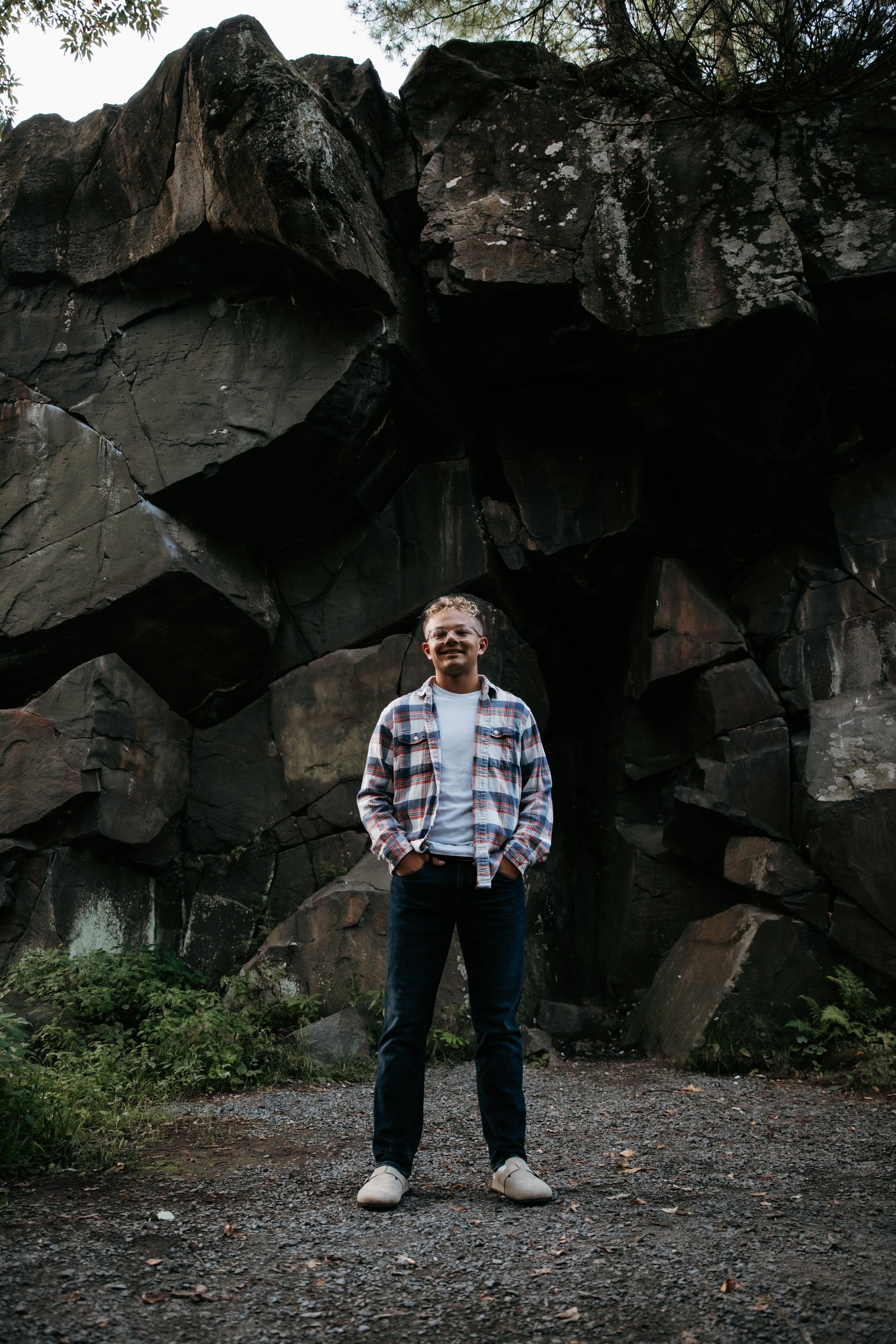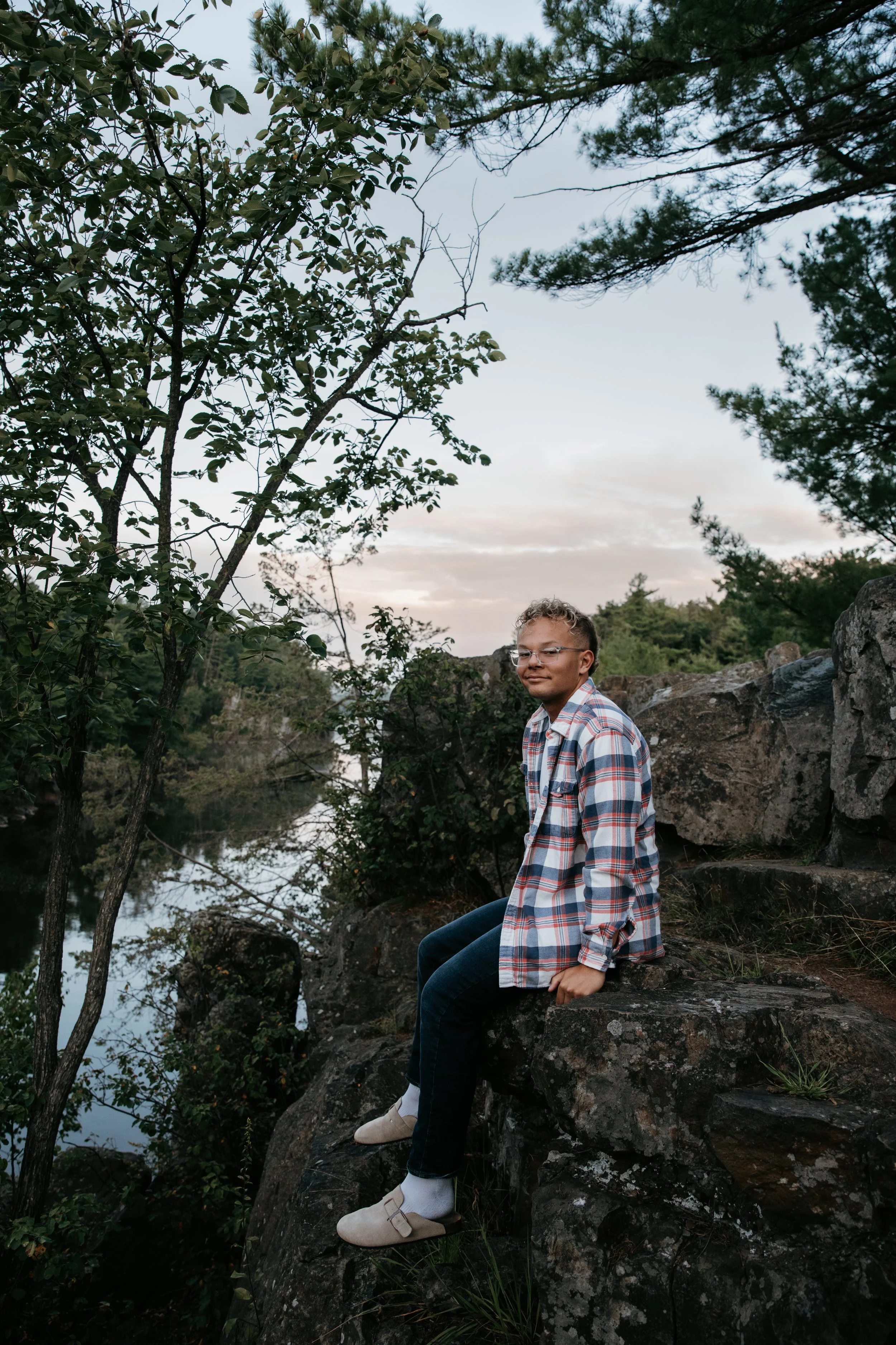 I always remind clients how you cannot control the weather or what a sunrise or sunset will look like, but the timing is our best shot to create great photos in outdoor lighting. Last year, I posted photos of Ruthie’s sunrise senior session over a lake, but now I want to show you Owen’s sunrise senior session at Taylors Falls. These sunrise sessions were on back to back days and we had different types of lighting at the same time of day in the same season, but both session’s photos turned out beautiful.
